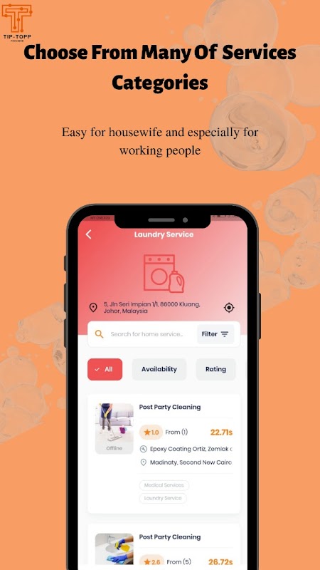 Tip-Topp, İsteğe Bağlı Hizmet Uygulamalarıdır! Evinizin veya ofisinizin güvenliğinde hijyenik bir hizmet deneyimi sağlamak için birçok adım attık. Uzmanlarımız servis öncesi maske, eldiven takar ve tüm ekipmanları dezenfekte eder. Uygulama aracılığıyla, kadınlar ve erkekler için güzellik ve sağlıklı yaşamdan, AC servisi, elektrikçi, tesisatçı ve marangoz gibi ev onarımları ve bakımına kadar evde veya ofiste hizmet rezervasyonu yapabilirsiniz. Ev ve ofis hizmetlerinin tam listesi aşağıdaki gibidir: