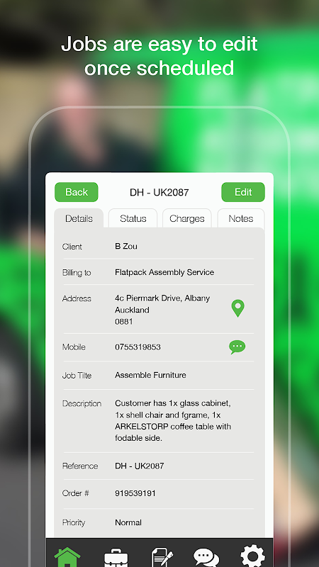 • Jobs are easy to edit once scheduled with the ability to change job status, add notes, charges and edit descriptions.
