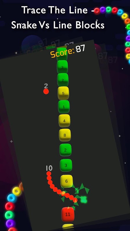 Trace Line - Snake Vs Line Blocks Swipe your finger to move left or right on the screen to move slither and break lines to get more score. Slither Snake will die if it breaks the red lines. To make Slither Snake interesting first break the green Line to create more interesting slither, it will help to avoid die. See How long you survive in Trace Line - Snake Vs Line Blocks Game.