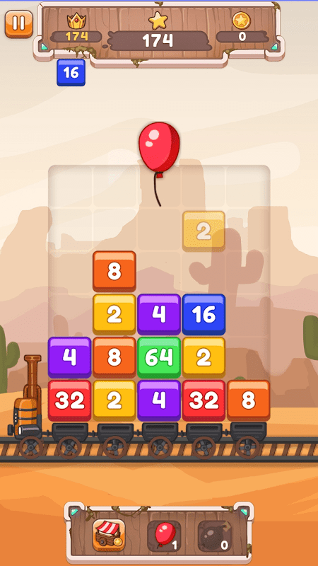 Grab your train ticket and hop onboard of the most fun 2048 games you've ever travelled with. Help the train driver feed the train's engine with coal to rush over the tracks and travel the whole world! In order to do that you have to match fitting number blocks with each other. Each match will provide the engine with some coal. But the train is still not fast enough for your taste? Try to create huge combos using your own skill or the powerful power-ups. Use the balloon to lift numbers blocking your matches, or throw a bomb onto the field to cause a massive explosion. So let's grab control of the train, travel the world and reach the biggest high score!