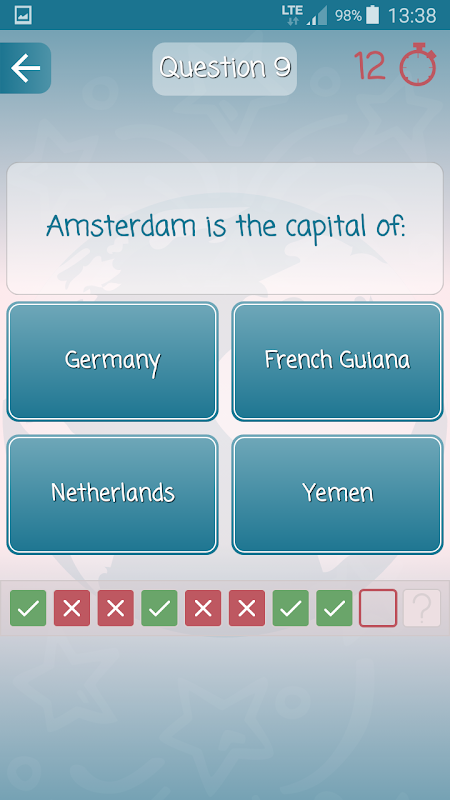 Bayrak, kıta, başkent, ülke kodu, arama kodu, nüfus, bölge, diller, para birimleri, ticaret blokları vb. gibi ülke bilgilerine göre farklı türde 10 soru içeren dinamik olarak oluşturulmuş bir sınavda bilginizi test etmek için Bilgi Yarışması Modunu kullanın.
