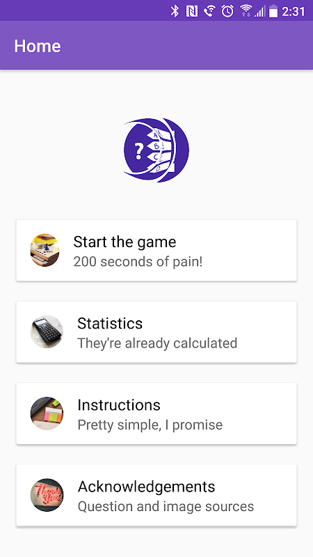 This app has a quiz, calculated statistics, instructions and acknowledgments to all content providers. In the quiz, click your desired answer to submit it immediately, and get immediate feedback after the quiz ends. In statistics, check out how you performed overall, on average and per category of question. Instructions lay everything out for you in simple language and acknowledgements provide the names of all websites from which questions and answers were referenced.