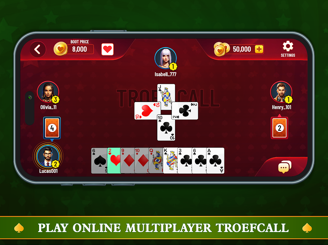 Akıllı yapay zekaya karşı tek başınıza oynayın veya gerçek zamanlı çok oyunculu modda arkadaşlarınıza meydan okuyun. Kozunuzu seçin, stratejinizde ustalaşın ve masaya hükmedin. İster sıradan bir oyuncu ister rekabetçi bir profesyonel olun, TroefCall derin bir oyun, kültürel tat ve heyecan verici ödüller sunar.