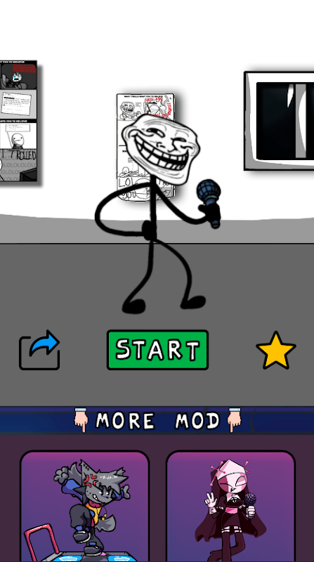Bu moddaki göreviniz çok basit: Trollface (Trollge) yardımıyla müzikal rap savaşını kazanmanıza yardımcı olacak bir parça oluşturmanız gerekiyor. Bunu yapmak için ana karakterin 4 düğmesini ve olağandışı hareketlerini kullanın. Her şey çok basit.