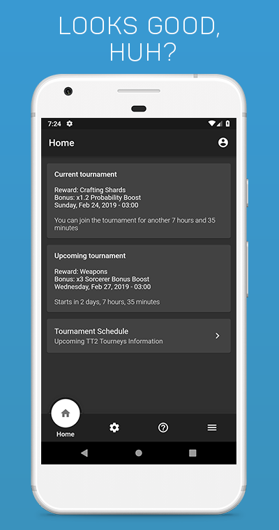- Widgets for the current (or previous) and next tournament on the main screen;