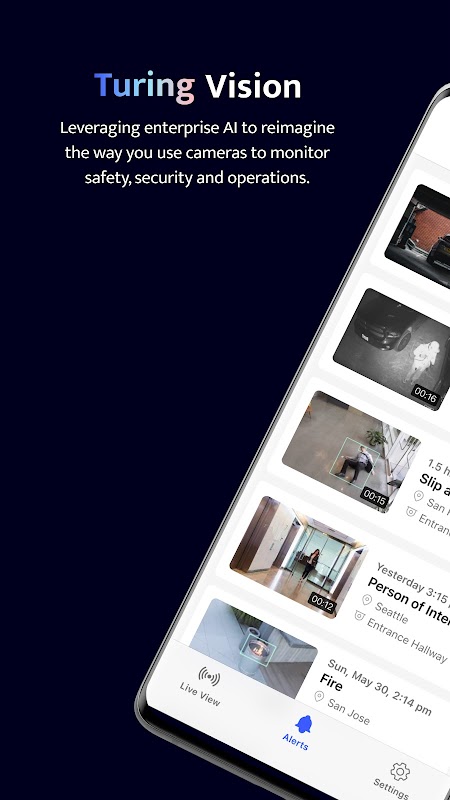 Çeşitli kurumsal düzeyde algoritmalarla desteklenen Turing Vision Mobile App, hem kamera akışlarınızı görüntülemenize hem de tüm konumlarınızda güvenlik ve güvenlik uyarılarını aramanıza ve bunlara yanıt vermenize olanak tanır.