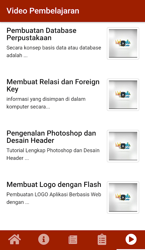 dengan tampilan menu bottom-Tabbar yang terdiri dari Home, Tentang Aplikasi, Petunjuk Pembelajaran, Silabus Materi Pembelajaran dan Materi Pembelajaran
