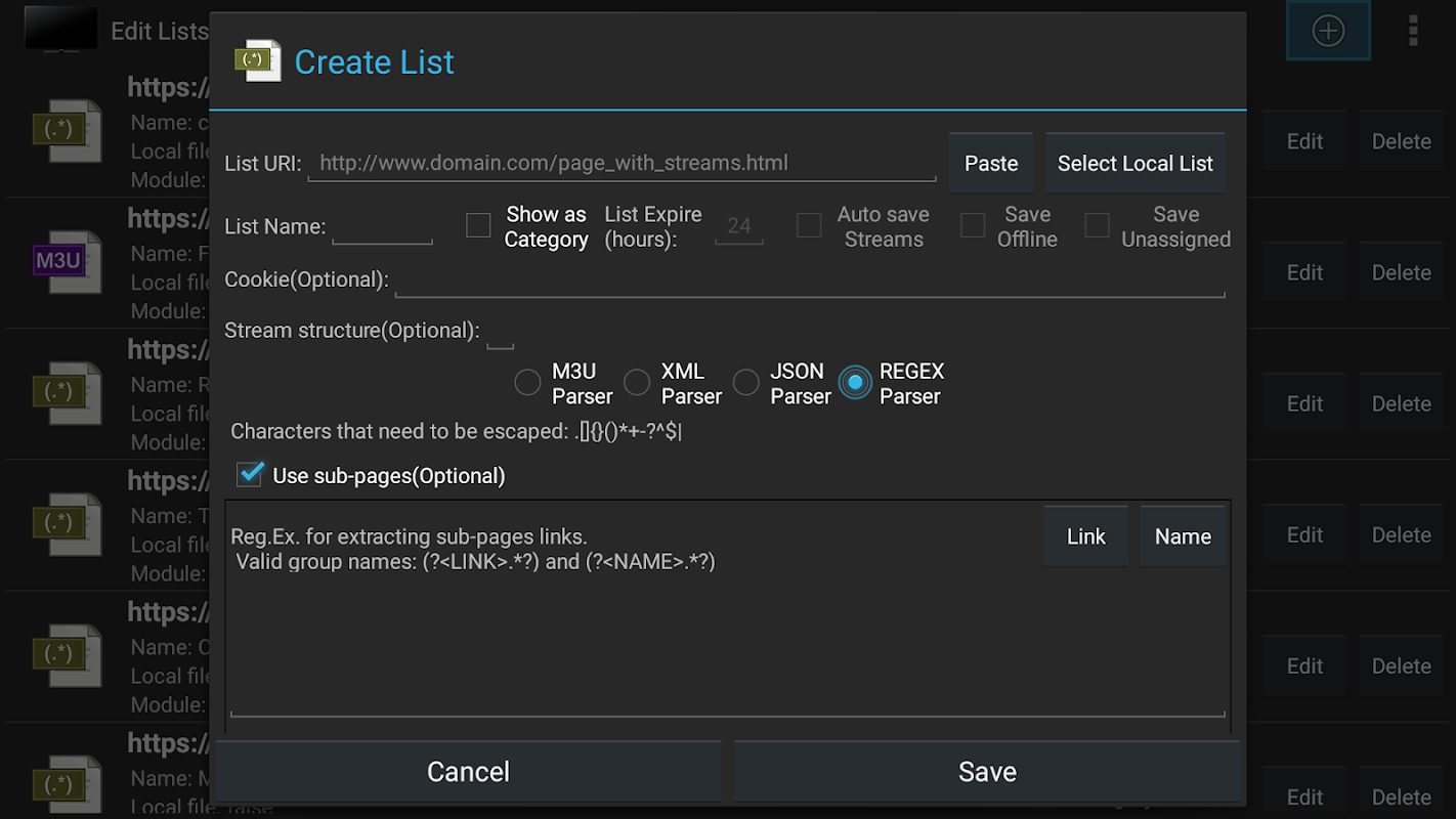 - Bir XML, M3U veya REGEX ayrıştırıcısı kullanarak akışları çıkarın,