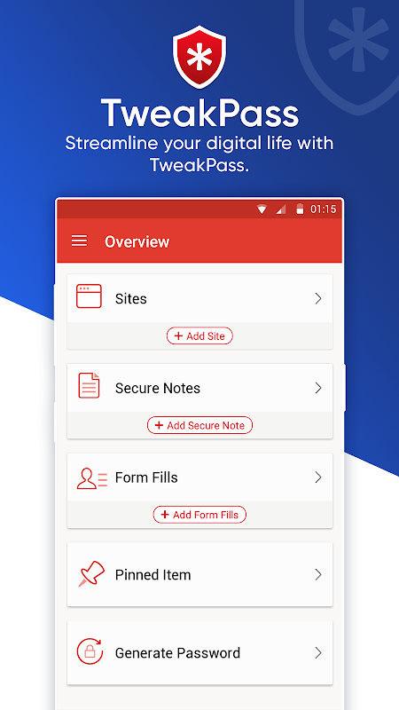 TweakPass, tüm şifrelerinizi ve kişisel bilgilerinizi AES şifreli güvenli bir kasada korur. Yapmanız gereken tek şey TweakPass ana şifresini hatırlamak ve uygulamanın sizin için tüm giriş bilgilerini otomatik olarak doldurmasına izin vermek.