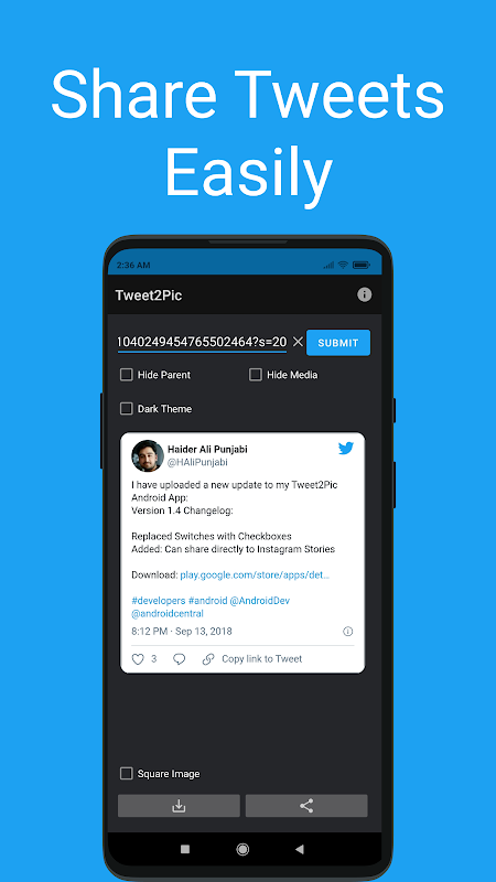 Tweet2Pic, Instagram için mükemmel olan kare çözünürlükte görüntüyü kaydetme/paylaşma seçeneği sunar.