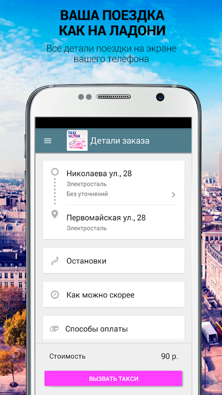 Чтобы вызвать машину через приложение ULTRA TAXI , достаточно нажать несколько кнопок на экране смартфона. Приложение сообщит Вам о стоимости заказа, времени подачи такси, госномере и марке автомобиля и будет держать Вас в курсе всех событий, касающихся выполнения заказа.