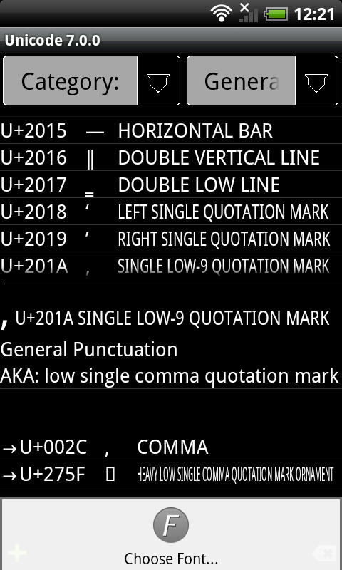 Browse the Unicode character set, examining characters by category or by similarity; search for names containing specified substrings; save a list of favourites for quick reference. Also copy and paste text between this and other Android applications.