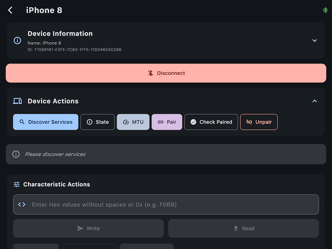 Universal BLE, Bluetooth Düşük Enerji (BLE) cihazlarını keşfetmek ve test etmek için güçlü bir açık kaynaklı geliştirici aracıdır.