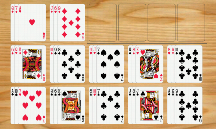 36 kartlı deste solitaire kart oyunları. Tüm kartlar, her biri 3 karttan oluşan destelere bölünmüştür.