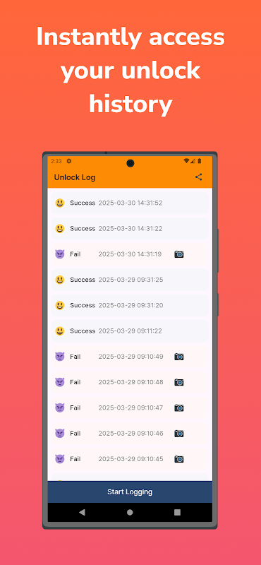 Bu uygulama, telefonunuzdaki hem başarılı hem de başarısız kilit açma girişimlerini günlüğe kaydeder. Birisi cihazınızın kilidini açmaya çalışırsa tüm kayıtları kontrol edebilirsiniz. Ayrıca deneme başarısız olursa, ön kamera davetsiz misafirin kimliğini tespit etmek için bir fotoğraf çekecektir.