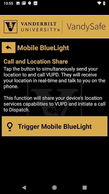 - Mobil Bluelight: Bir kriz durumunda konumunuzu gerçek zamanlı olarak Vanderbilt Üniversitesi güvenliğine gönderin