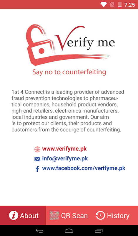 Verify Me app let you scan the QR code on the products, once you scan QR code it will automatically detect it as legal or counterfeit product.