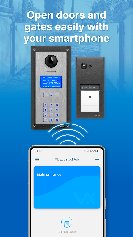 Videx Virtual Fob, NFC teknolojisini kullanarak yakınlık okuyucularıyla donatılmış Videx kapı istasyonlarının çıkışlarını çalıştırmanızı sağlayan ücretsiz bir akıllı telefon uygulamasıdır.