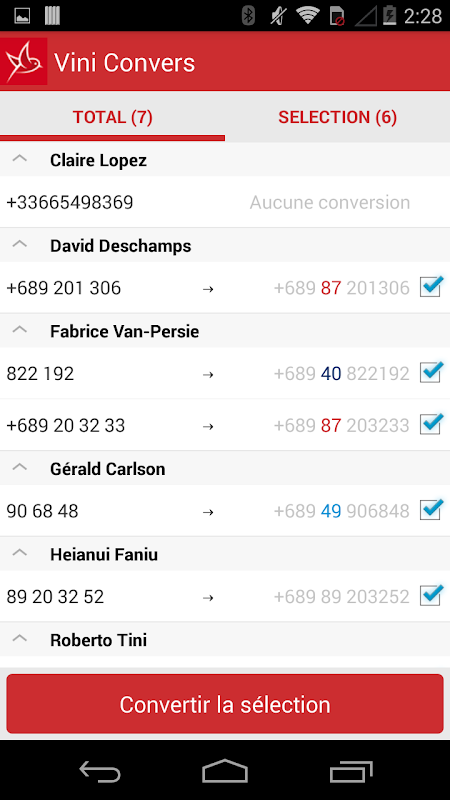 Une fois l'installation de "Vini Convers" terminée, il vous suffit de lancer l'application et de suivre les instructions. L'application se charge alors de détecter automatiquement les numéros de Polynésie française de votre répertoire qui doivent être modifiés et vous affiche en temps réel le préfixe qui sera ajouté pour chaque numéro. Vous avez alors le choix d'ignorer certains numéros et il ne vous reste plus qu'a appuyer sur le bouton démarrer, votre répertoire est maintenant converti !