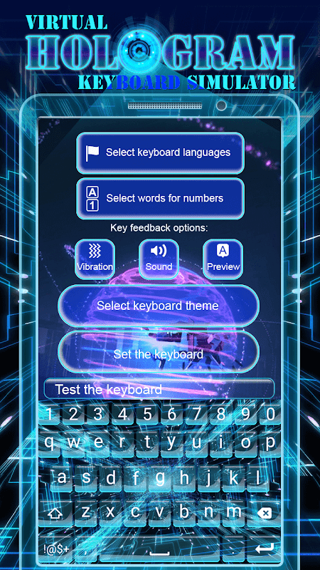 ✈ The future is now! The ✯ Virtual Hologram Keyboard Simulator ✯ provides proof of that! This absolutely amazing “laser projection keyboard” will make your smartphone or tablet device look so futuristic that people will think that it really comes from the future! With this “free virtual keyboard” you can easily impress all your friends and give your keypad a hi-tech design that looks stunning. It's a “holographic keyboard” made for all fans of the science fiction world. Even though it looks complicated, this “transparent keyboard” is actually quite simple to use. You just need to click the buttons for downloading and installing the keypad app, and you'll be the proud owner of one of the best “keyboard themes” out there! Get yourself a “neon keyboard” and embark on a cosmic adventure with your phone!