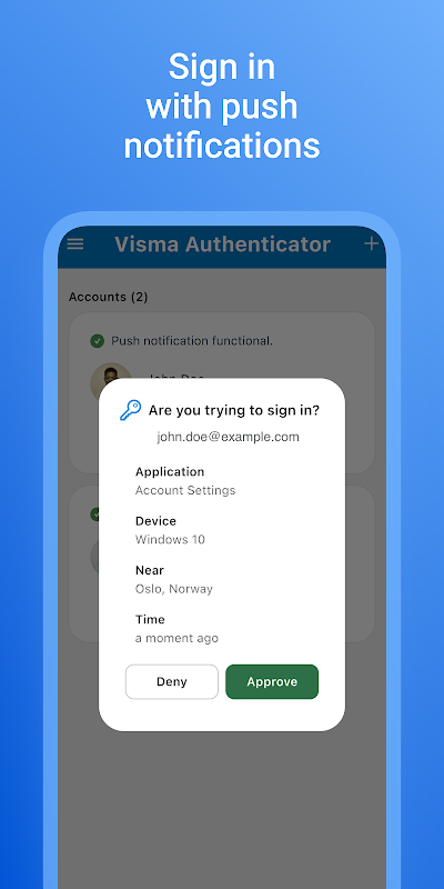Visma Connect kullanıcılarının anlık bildirimler aracılığıyla oturum açma işlemlerini onaylamasına olanak tanır.