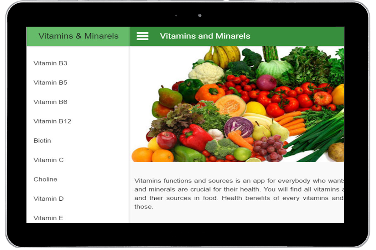 Vitamin function and sources is a app for everybody who wants to know what type of vitamin and mineral are crucial for our health. You will find all vitamin and mineral well organized and their source in food. Health benefits of every vitamin and mineral, which food contain those.