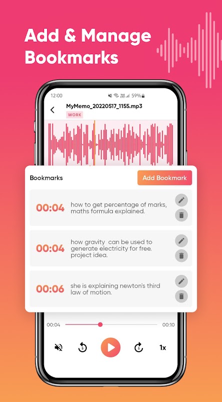 Bu HQ mp3 kaydedici uygulaması, bunları yönetmek, kategorilere ayırmak ve yer imlerine eklemek için birçok gelişmiş ses kayıt işlevine ve özelliğine sahip olduğundan çok yararlı olabilir. Öğrenciler çevrimiçi dersleri öğrenirken derslerini kaydedebilir ve ses kayıtlarının belirli bir bölümünü bulmak için yer imleri koyabilir. Bu şekilde, bu yararlı ses kaydedici uygulamasını kullanarak çok uzun ses kaydındaki en önemli konuları filtreleyebilirler.