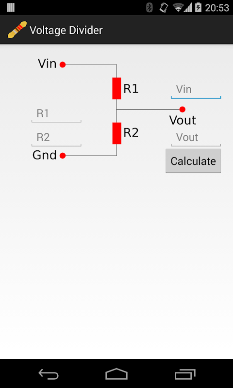 The Voltage Divider Calculator allows you to easily solve problems with resistor dividers. It returns the Vout of a given Vin, R1 and R2.