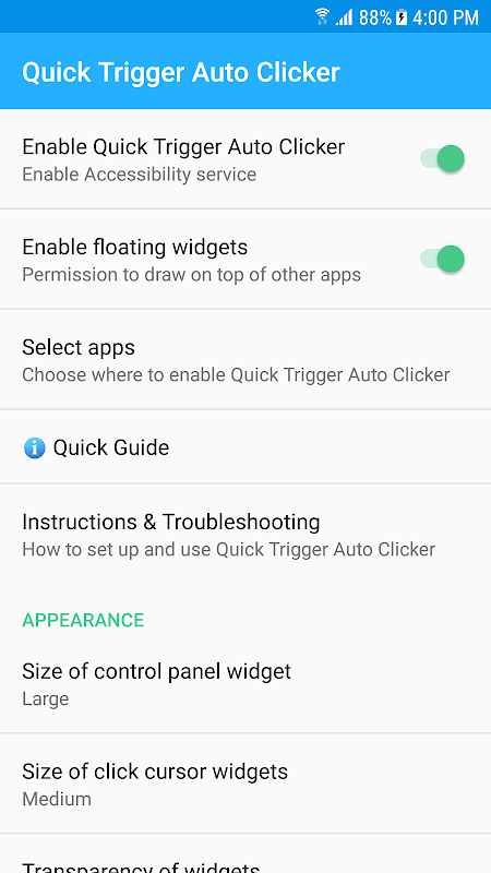 NOT: Android'in erişilebilirlik çerçevesindeki sınırlamalar nedeniyle, ses seviyesi tuşları tarafından tetiklenen bir tıklama, devam eden herhangi bir manuel dokunma hareketini kesintiye uğratır. Bu, bir eylemi tetiklerken (tipik bir nişancı oyununda olduğu gibi) hareket için diğer parmağınızı ekranda tutmanız gereken oyunlarda uygulamanın çalışmadığı anlamına gelir.