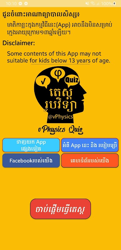 vPhysics Quiz App ឬ កម្មវិធី“តេស្តរូបវិទ្យា” នេះត្រូវបានអភិវឌ្ឍដោយក្រុមការងារ រូបវិទ្យាយើង vPhysics។ គោលបំណងនៃការបង្កើតកម្មវិធីនេះឡើងគឺដើម្បីឲ្យប្អូនៗសិស្សានុសិស្ស បានកំសាន្តប្រកបដោយចំណេះដឹង។ App នេះនឹងជួយរំឮក មេរៀន ទ្រឹស្តី រូបមន្ត និងបាតុភូតរូបវិទ្យាតាំងពីថ្នាក់ទី៨ ដល់ថ្នាក់ទី១២។