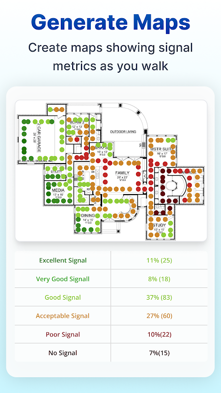 WalkTest, RSRP, RSRQ, SINR, indirme hızı, yükleme hızı, gecikme süresi, NCI, PCI, eNodeBID, frekans bantları, eNodeB Kimliği ve daha fazlası dahil olmak üzere çok çeşitli hücresel KPI'ları ölçmenize ve haritalamanıza olanak tanır.