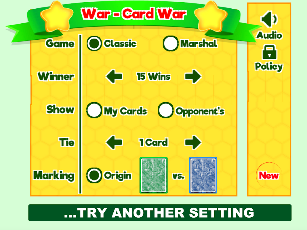Oynanan iki kartın da eşit değerde olması durumunda, bir "savaş" meydana gelir. Ayarlara bağlı olarak, masaya 1 ila 15 kart yerleştirilir ve bir kez daha, daha yüksek karta sahip olan oyuncu "savaşı" kazanır ve dahil olan tüm kartları alır.