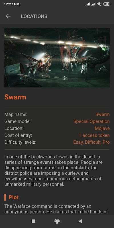 The application contains information about weapons, badges, modules, ranks of the project Warface.