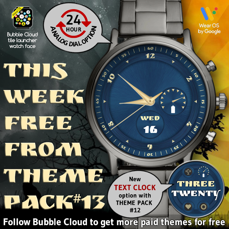 Bu mini örnekleyici tema "paketi", bu hafta Tema Paketi #13'ten yalnızca tek bir tema içeriyor. Bu temayı veya bileşenlerini (yazı tipi/kadran/eller/arka planlar/kabarcıklar) uygulamaktan ve sınırlama olmaksızın kullanmaktan çekinmeyin: Farklı bir tema uygulayana kadar bu sizindir -- elbette bir Bubble Cloud yedeğini alın ve gelecekte istediğiniz zaman geri yükleyin.