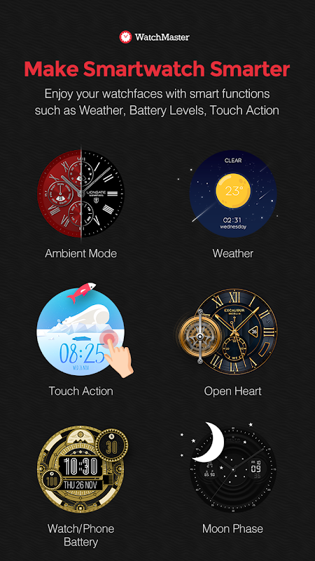 Our application contains a marvelous collection of watchfaces(watch backgrounds) crafted by our finest and certified global designers.