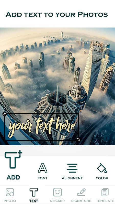 + Gerek yok! Filigran Oluşturucu ile iki uygulamayı bir arada elde edersiniz; muhteşem fotoğraflara yazma özelliğimizle fotoğraflara metin ekleyebilirsiniz.