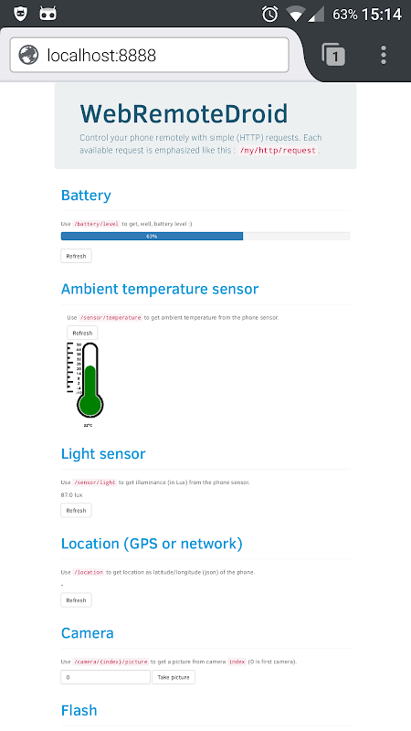 Örneğin, pil seviyesini öğrenmek için tarayıcınızda aşağıdaki URL'yi kullanın: http: // telefonunuz: 8888 / pil / seviye. Karşılığında metin olarak pil yüzdesini almalısınız.