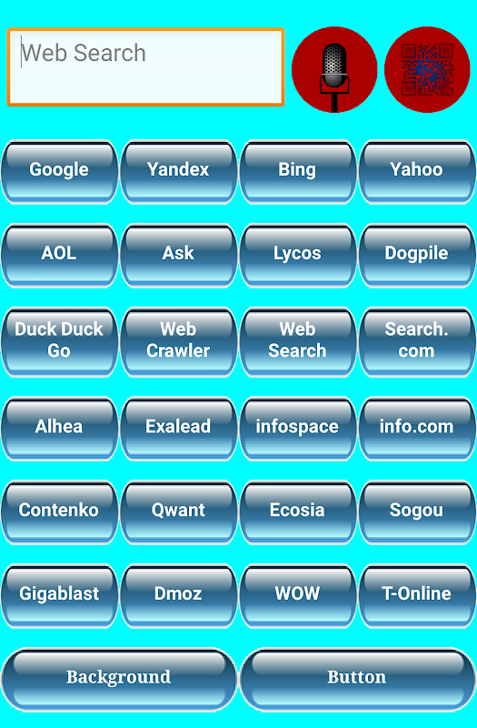 The best search engines are ready at your fingertips such as Google, Yandex, Bing, Yahoo and many more. You can create the Search app according to your color scheme by opening the Background and Button menu at the bottom. There you can select many backgrounds, buttons and text colors freely and create your search app according to your color palate. Type your keyword into the text field or speak the word pure. As well as a barcode scanner you can use for example to scan a product and search in the search engines by clicking and compare in the best search engines. You only have to enter your search keyword or scan the product EAN / QR. Then you can select your favorite search engines or click to search for more search results such as how to open multiple search engine apps one at a time or open and search with all engines in the web browser at the same time. The web search engines app is easy to use and allows for uncomplicated searching and quick comparing in the world wide web!