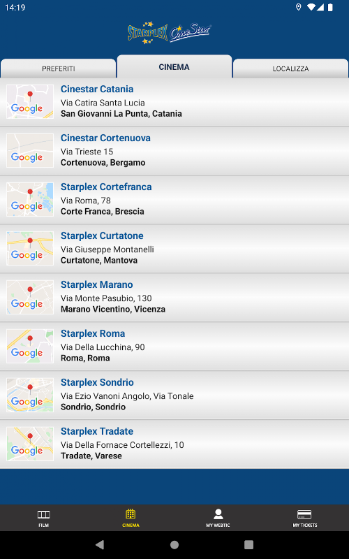 Marano Vicentino, Roma, Sondrio, Curtatone, Catania, Cortefranca ve Tradate'deki prestijli Starplex ve Cinestar sinemalarında koltuk satın almak ve rezervasyon yapmak için Crea Informatica uygulaması.