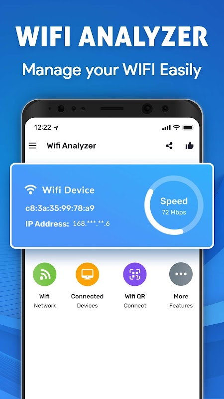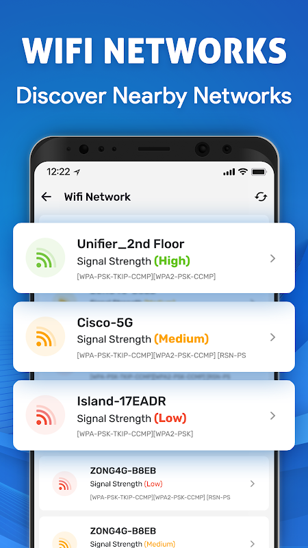 Wifi Analizcisi bu uygulamanın ana özelliğidir. Wifi Gücünü ve bölgenizdeki kullanılabilir bağlantı sayısını gösterir. Cihazınız için en iyi ağı seçebilirsiniz. Yakındaki Wi-Fi sinyallerini tarayabilir ve güce ve kararlılığa göre en iyi ağı bulmanıza yardımcı olabilir.