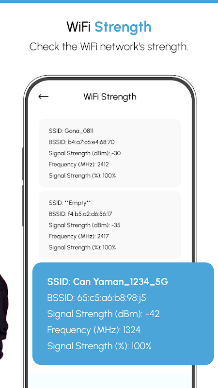 WiFi Harita Şifresi uygulaması aynı zamanda kullanıcıların yakındaki Wi-Fi ağ listesini ve ayrıntılarını kolayca anında tarayabileceğiniz WiFi tarama seçeneğini bulmasına da olanak tanır. Artık WiFi sinyal gücü çubuk grafiğini kolayca alın ve bu WiFi Harita Şifre Uygulamasını kullanarak güç ayrıntılarını da bulun. Artık sadece bu WiFi Harita Şifre Uygulamasını yerleştirerek gittiğiniz her yerde ağ ile bağlantıda kalmak çok kolay.