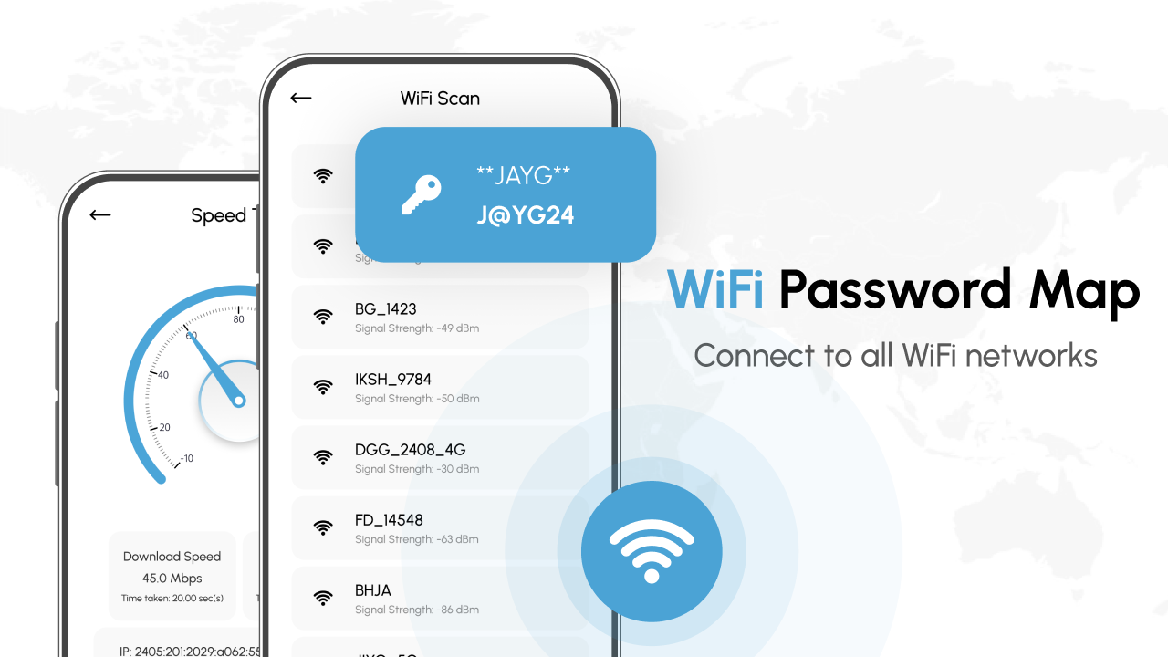 WiFi Harita Şifresi uygulaması, yalnızca bir harita şifresi kullanarak Wi-Fi ağına kolayca erişmenin basit bir yolunu sağlar. Artık herkesin Wifi ağını ve ayrıntılarını kolayca bulmasına olanak tanıyan bu WiFi Harita Şifresi uygulamasını kullanarak ağa istediğiniz zaman, istediğiniz yerde kolayca bağlanın. Ayrıca ağınızın doğru hız ayrıntılarını alma seçeneğini de bulabilirsiniz; artık çevrimiçi hız test cihazına girmenize gerek yok, sadece bu uygulamayı kullanın ve hız test cihazı aracı seçeneğine sahip olun ve yükleme, indirme ve sunucu ayrıntılarını anında bulun.
