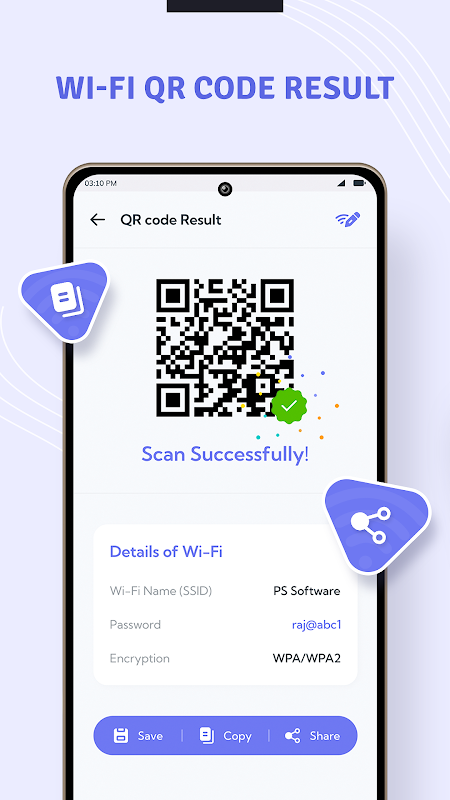 Herhangi bir wifi qr kodunu tarayarak, WiFi ağ adını (SSID), şifreyi ve güvenlik yöntemleri ayrıntılarını alacaksınız. Panoya kopyalayabilir veya arkadaşlarınızla ve ailenizle paylaşabilirsiniz.