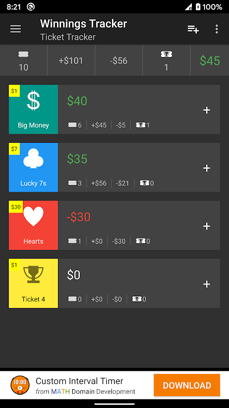 Kazanç Takibi kazı kazan biletleri, kazı kazan kartları ve daha fazlası için kazançlarınızı ve kayıplarınızı takip etmenize yardımcı olur.