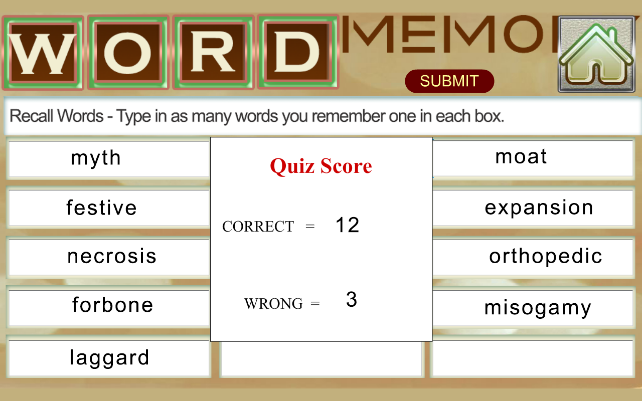 1. WORD MEMORY:: Word Memory game is one of our working memory exercises that tests for verbal span. This type of memory is what allows us to remember what we hear or read long enough to use the information, either right then and there or by transferring it to long-term memory.