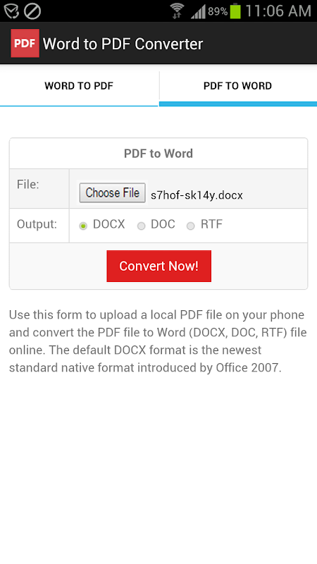 İlk olarak, daha sonra, (farklı sunucu farklı dönüşüm motoru kullanır) dosyanızı dönüştürmek "Şimdi Convert" butonuna dosya upload etmek dokunun Linux sunucu veya Windows sunucu birini seçin, Android telefon bir Word DOCX, DOC veya RTF dosyası seçin bu dönüşüm tamamlandığında indirmek için bulut sunucusu, sunucu çıktı dosyaları dönecektir.