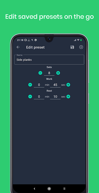 💪 Antrenman setlerinizi, çalışma ve dinlenme zamanlayıcılarınızı kolayca ayarlayabilir ve antrenmanınıza başlayabilirsiniz.
