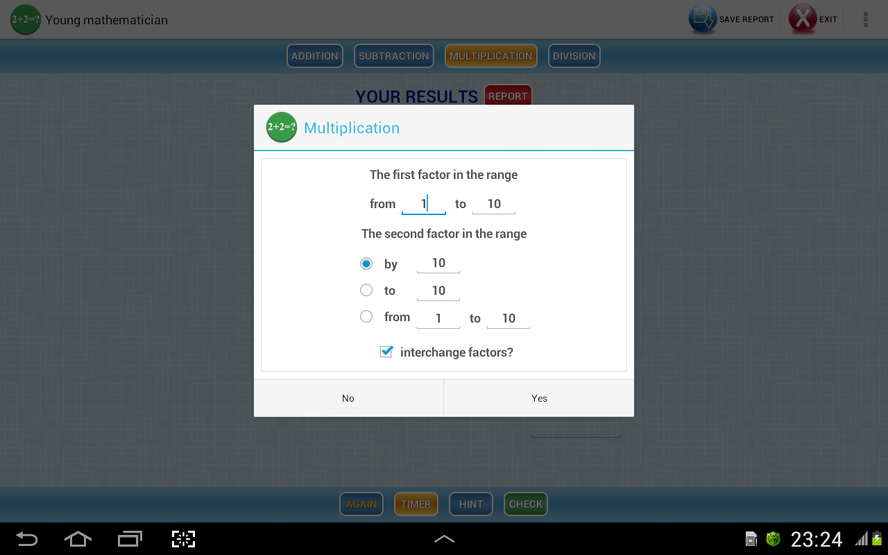 1.1 (04.2013) - timer added. Multiplication and division settings are enhanced. The ability to save and load a report on the latest results of the user is added.
