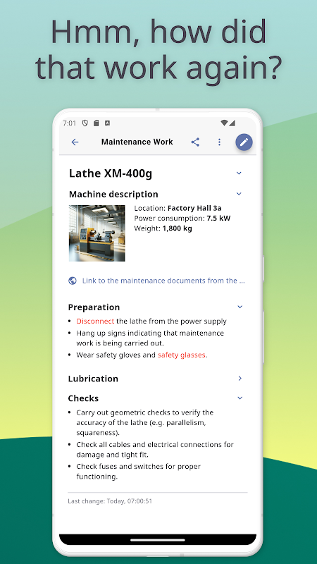 Kolay kullanım ve iyi tasarlanmış bölüm şablonları sayesinde bilgilerinizi zahmetsizce ve düzenli bir şekilde derleyebilirsiniz. Böylece değerli zamanınızı metin biçimlendirmek veya resim eklemekle harcamazsınız. Okuyucu dostu görüntüleme modu, içeriğe daha sonra kolayca bakmanızı sağlar. İçeriği yanlışlıkla değiştirmek imkansızdır - akıllı ve basit.