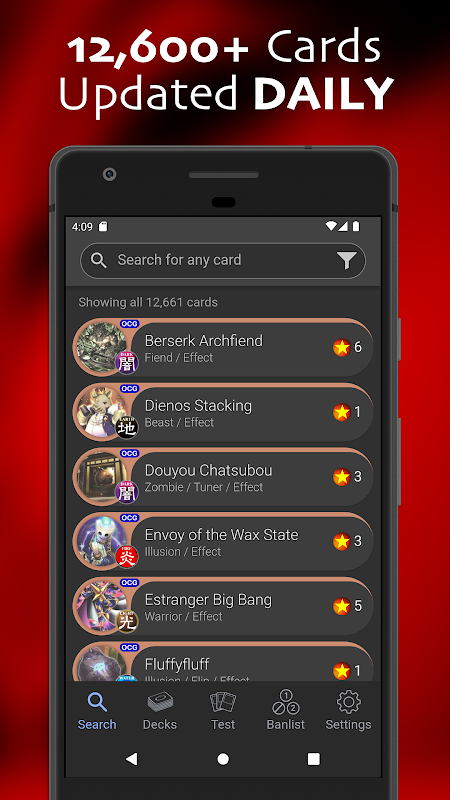 En önemlisi, uygulama her başlatıldığında otomatik olarak en son kart listesini alır, böylece en yeni YGO kartlarını almak için uygulama güncellemesi için birkaç gün/hafta beklemenize gerek kalmaz!